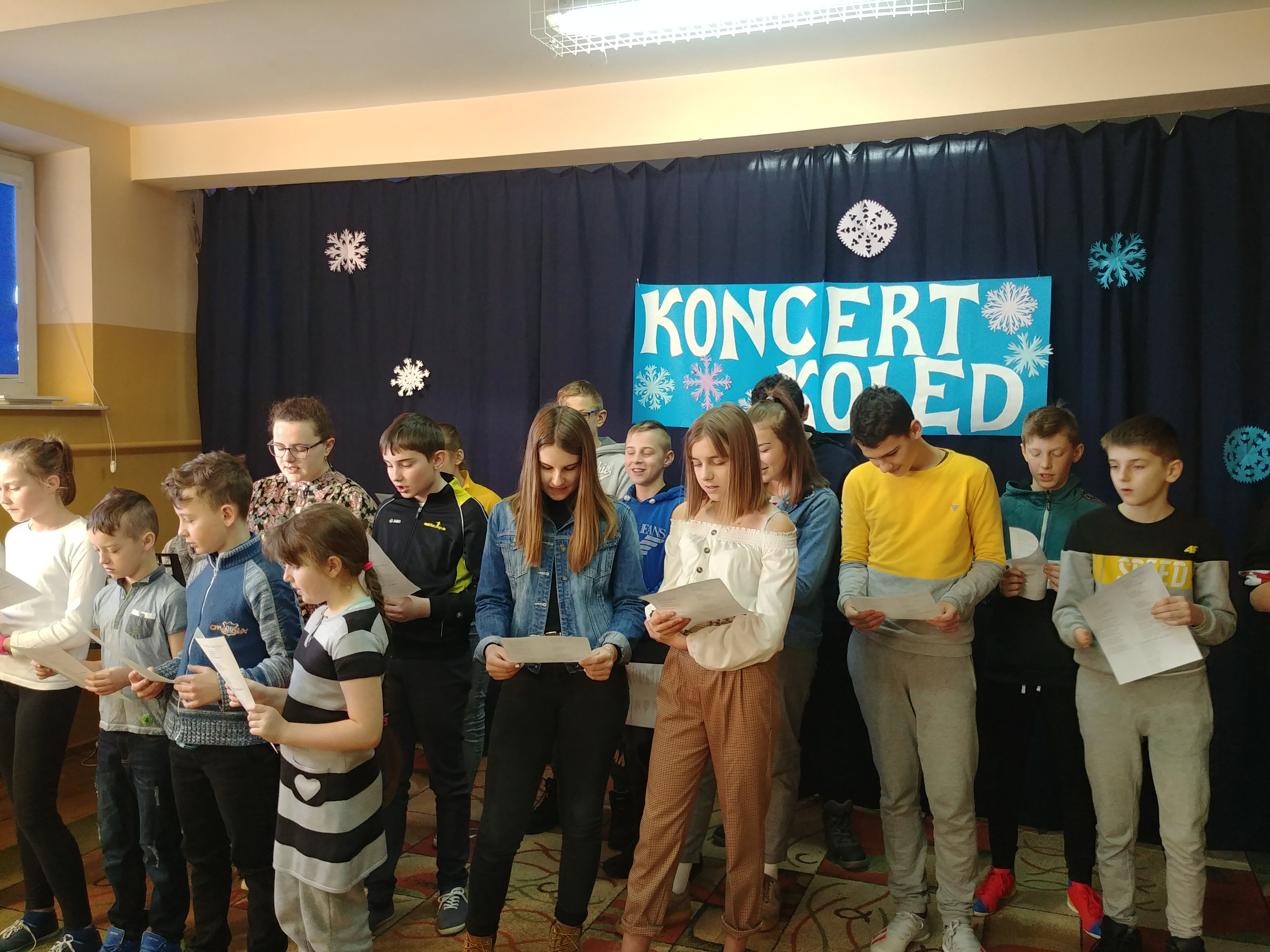 Klasy wspólnie zaprezentowały kolędy i pastorałki przy akompaniamencie Pani Agnieszki Warczak- naszego nauczyciela muzyki