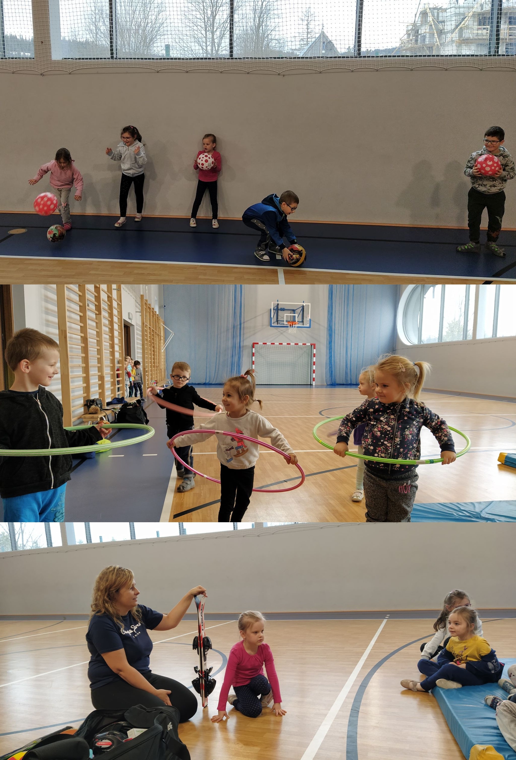 25 lutego 2020 r. na sali gimnastycznej odbyły się zawody sportowe naszych przedszkolaków. Dzieci brały udział w różnych konkurencjach sportowych, m.in. w: torze przeszkód, skakaniu na piłkach i skakankach. W ruch poszły też koła hula- hop. Zabawy było co niemiara a każdy uczestnik dał z siebie wszystko i w nagrodę został odznaczony "złotym medalem"