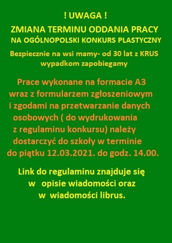 Pracownik KRUS w Zakopanem przekazał dzisiaj wiadomość, że został skrócony termin oddania prac na Ogólnopolski Konkurs Plastyczny pt. Bezpiecznie na wsi mamy- od 30 lat z KRUS wypadkom zapobiegamy.