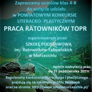 W związku ze zbliżającym się Dniem Patrona Szkoły- Ratowników TOPR już po raz kolejny nasza szkoła organizuje powiatowe konkursy: literacki oraz plastyczny pt."Praca Ratowników TOPR".