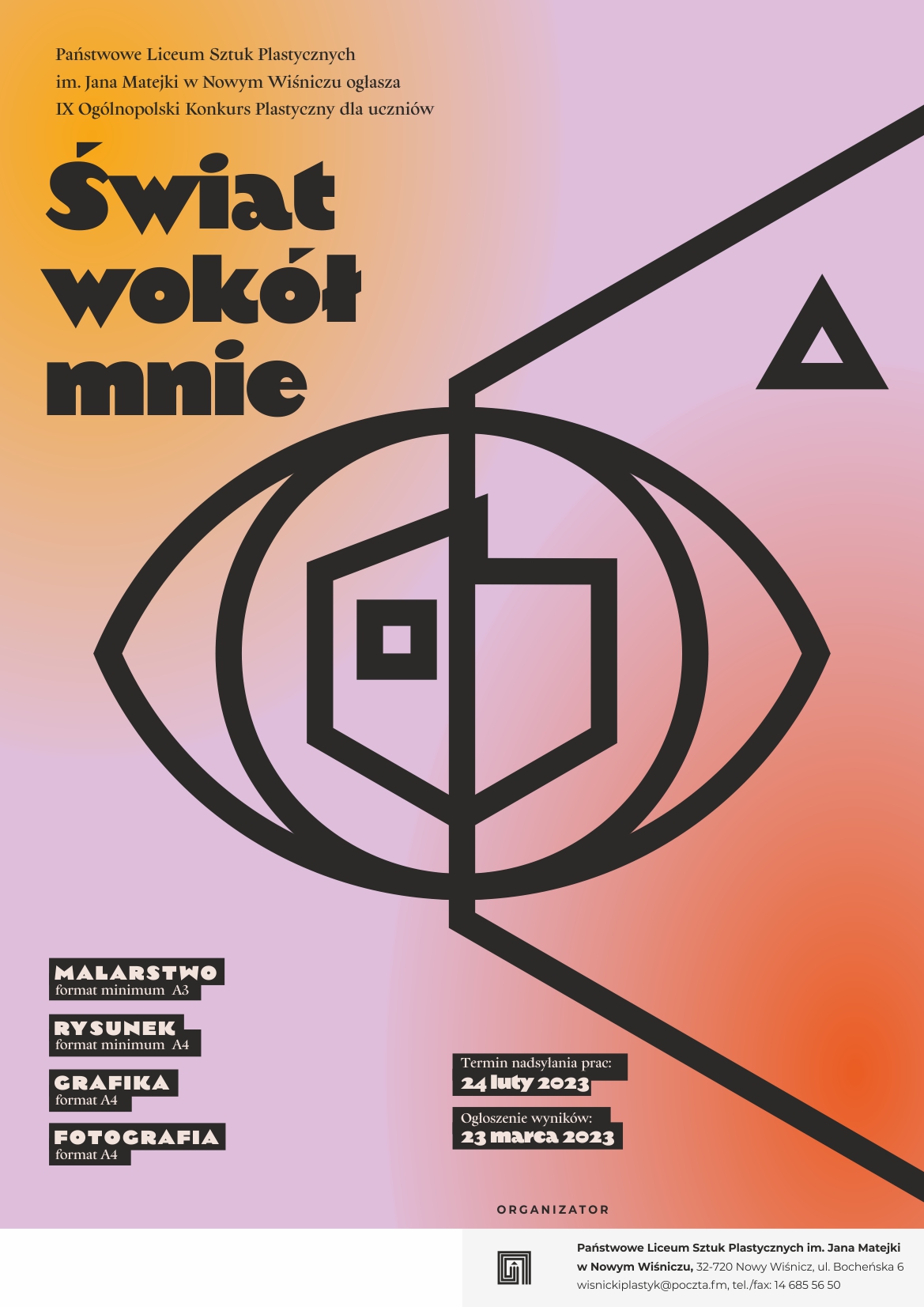 Zapraszamy uczniów klas siódmych i ósmych szkoły podstawowej do wzięcia udziału w IX Ogólnopolskim Konkursie Plastycznym "Świat wokół mnie". Termin nadsyłania prac w kategoriach: rysunek, malarstwo, grafika i fotografia - 24 luty 2023r.
