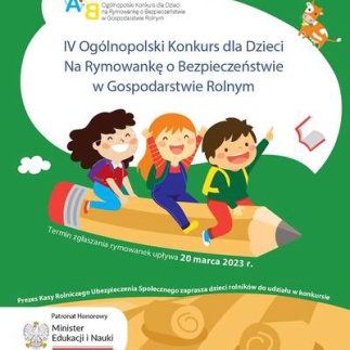 Kasa Rolniczego Ubezpieczenia Społecznego serdecznie zaprasza dzieci rolników do udziału w Ogólnopolskim Konkursie dla Dzieci na Rymowankę o Bezpieczeństwie w Gospodarstwie Rolnym „Bezpiecznie na wsi mamy, niebezpiecznych substancji unikamy” pod Patronatem Honorowym Ministra Edukacji i Nauki.