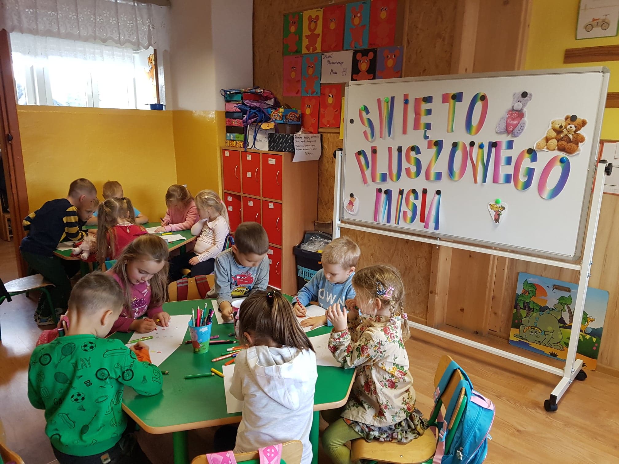 Przedszkolaki obchodziły Święto Pluszowe Misia. Był taniec - przytulaniec ze swoim misiem, zagadki o misiach z bajek i małe co nieco w postaci miodku, misiów Haribo i lubisiów.