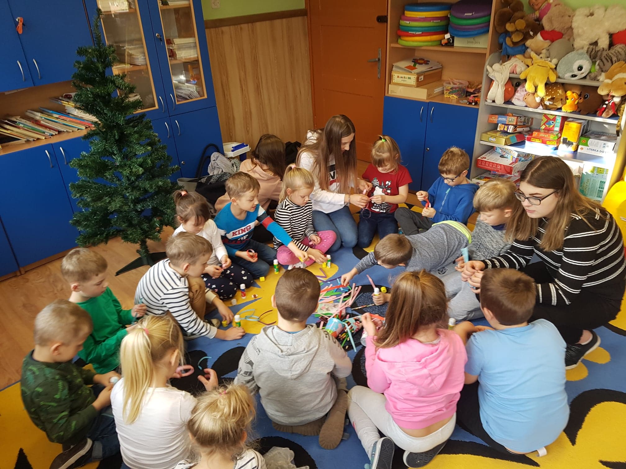 Nasze wolontariuszki 13 grudnia zorganizowały warsztaty świąteczne w przedszkolu. Wolontariuszki przygotowały pomoce na warsztaty, podczas których wykonały ozdoby choinkowe wspólnie z najmłodszymi uczniami naszej szkoły. Kolędowanie z przedszkolakami połączone z warsztatami plastycznymi to dobra okazja do poświecenia swojego czasu dla drugiego człowieka. Spotkanie to miało na celu pokazanie, że poprzez pomoc w wykonywaniu ozdób choinkowych młodzież może być autorytetem dla najsłodszych uczniów naszej szkoły.