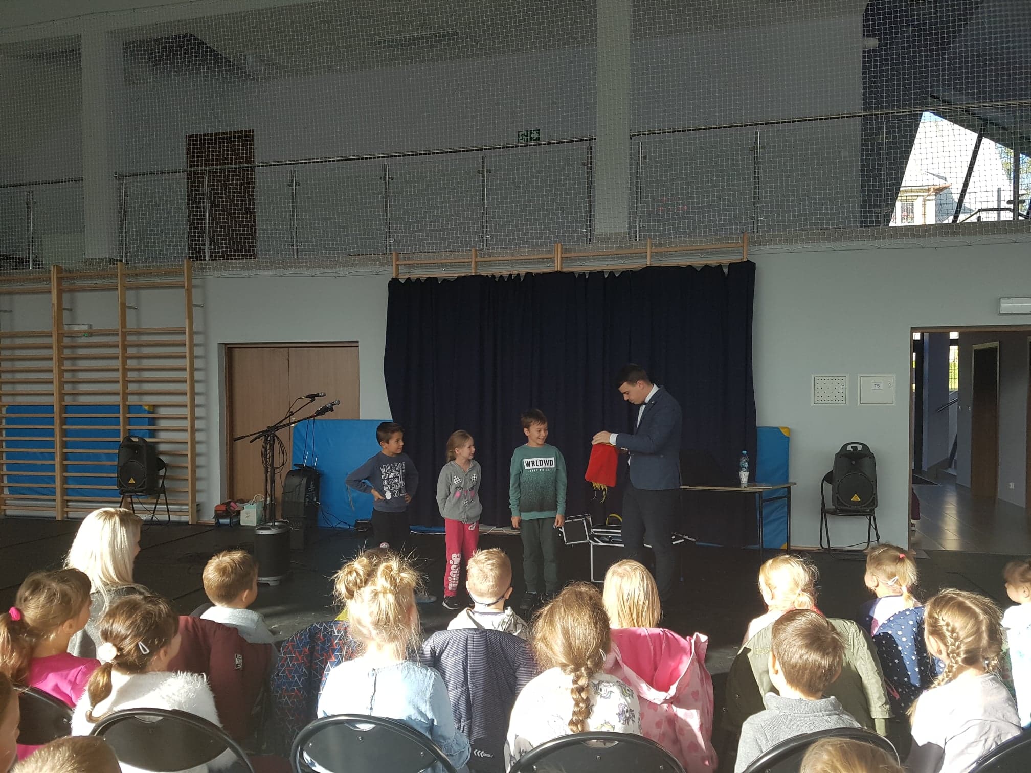 Czary mary czyli występ ILUZJONISTY. Przedszkolaki oraz uczniowie klas I-III uczestniczyli w pokazie sztuczek magicznych, na szczęście niestrasznych, z wybuchami salw śmiechu. Bardzo nam się podobało. Wszyscy na koniec zostali odczarowani i wrócili do sal...