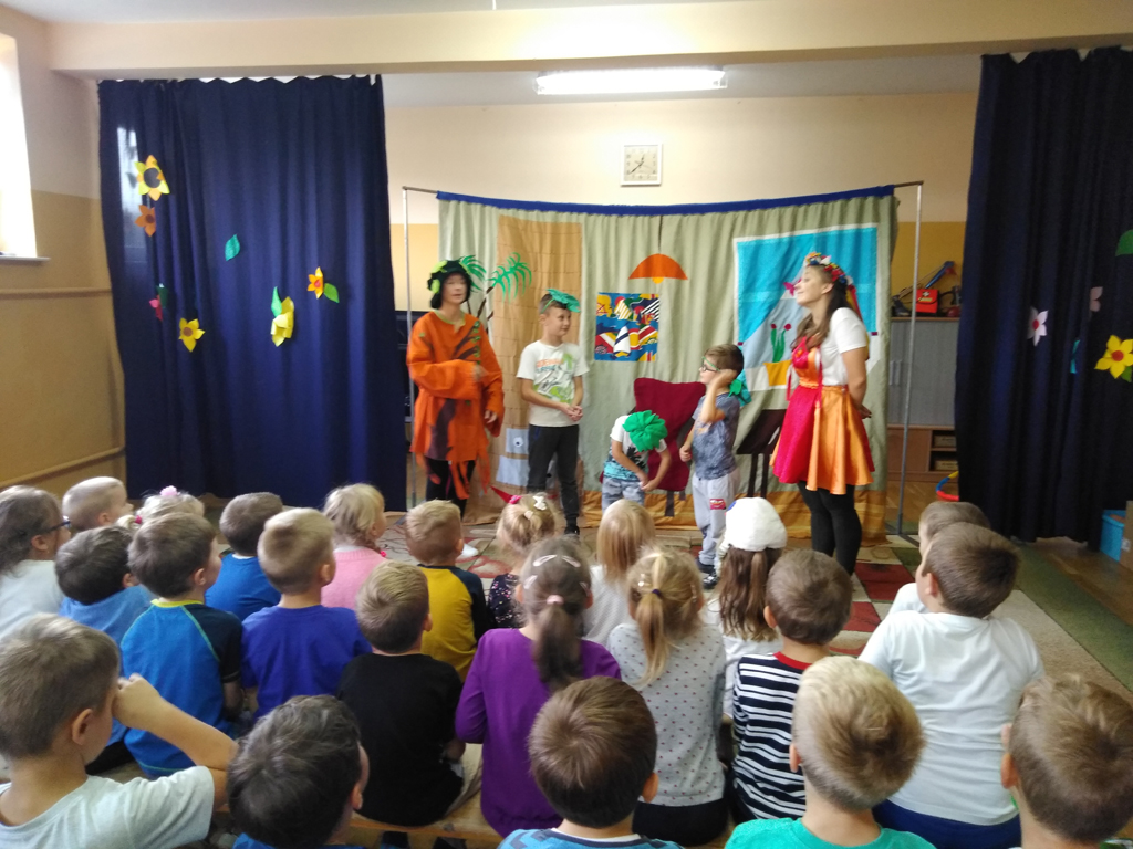 nasze przedszkolaki uczestniczyły w przedstawieniu teatralnym "4 mile za piec" w wykonaniu grupy teatralnej Skrzat z Krakowa.