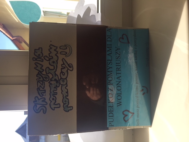 Zachęcamy wszystkich do inspirowania wolontariuszy różnymi zadaniami,akcjami a także informowania o osobach potrzebujących! Inspiracje należy napisać na kartce, a następnie wrzucić do „SKRZYNKI Z POMYSŁAMI”.
