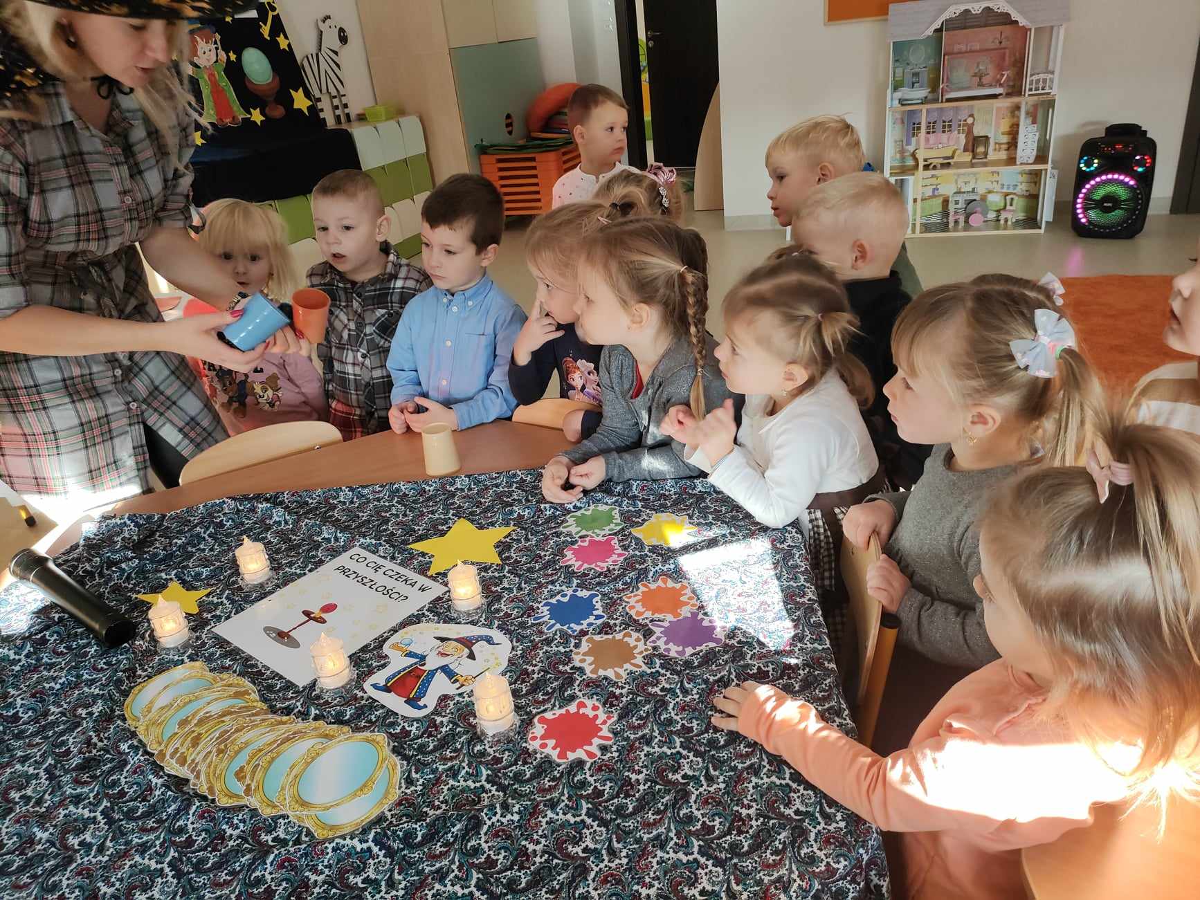Andrzejki są wspaniałą zabawą, dostarczającą wielu przeżyć i emocji. To czas czarów, wróżb i przepowiedni co przyniesie los. Nasze przedszkolaki również chciały zajrzeć w przyszłość i sprawdzić co je czeka, więc panie zabrały dzieci do świata magii i czarów. Przedszkolaki sprawdzały co je czeka w przyszłości (imię przyszłej dziewczyny/ chłopaka, zawód jaki będą wykonywać, itp). Czy wróżby się spełnią – przyszłość pokaże. Pewne jest to, że przyniosły nam one wiele radości, były okazją do wspólnej zabawy. Ten magiczny dzień wróżb i czarów bardzo spodobał się dzieciom, zwłaszcza że tradycyjnie miały również krótką zabawę przy dźwiękach wesołej muzyki, jak również słodki poczęstunek.