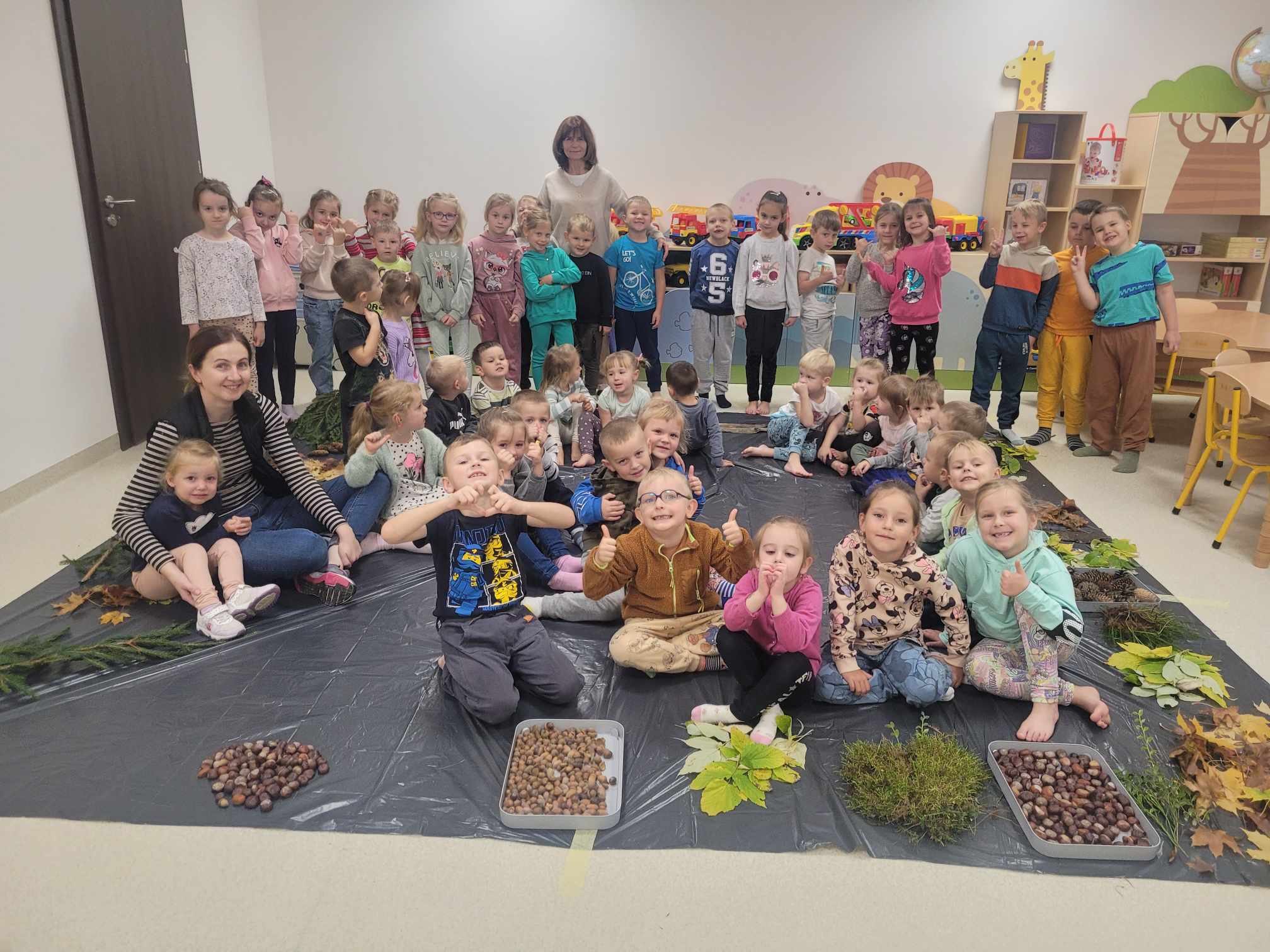 Dzisiaj wspólnie z Liskami, Sówkami i Jeżykami postanowiliśmy wykorzystać dary Pani Jesieni i stworzyć jesienną ścieżkę sensoryczną, utworzoną z liści, igieł sosny, kasztanów, żołędzi i szyszek. Chodzenie po niej nie było łatwe. Taka ścieżka sensoryczna ma bardzo duże znaczenie dla dziecięcych stópek – usprawnia motorykę dużą, rozwija wrażenia dotykowe, poprawia równowagę i koordynację ruchową i przede wszystkim stymuluje receptory. Ścieżka sensoryczna pozwala rozwijać wyobraźnię dotykową, która jest niezbędna do prawidłowego poznawania świata przez dziecko. Spacer po wyznaczonej trasie sprawił naszym przedszkolakom mnóstwo radości i satysfakcji. Z pewnością kiedyś ją powtórzymy.
