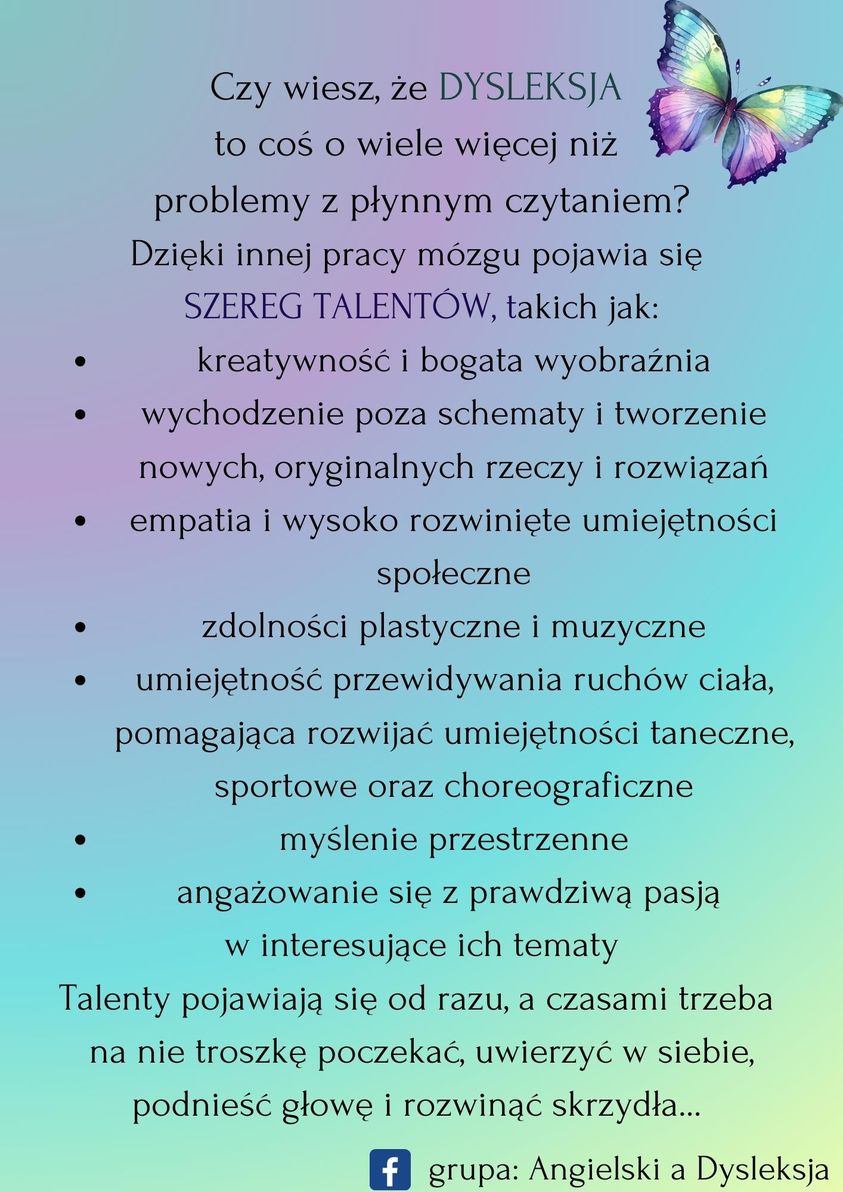 W naszej szkole o DYSLEKSJI będziemy mówić w listopadzie. Ale już teraz chcemy zwrócić uwagę na pozytywne aspekty dysleksji, gdyż na rynku pracy dyslektyczne umiejętności są bardzo poszukiwane. Tak wiele się mówi o jej negatywnej stronie a tak mało o tych pięknych rzeczach, które z niej wynikają.