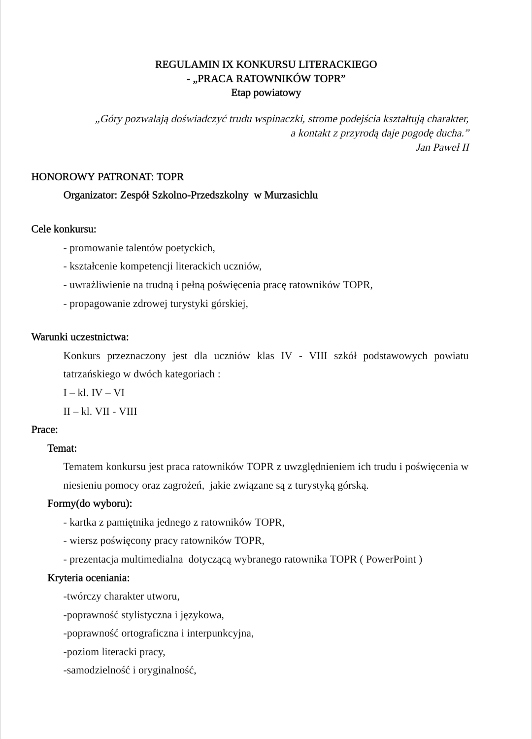 Zapraszamy uczniów do wzięcia udziału w powiatowym konkursie plastycznym i literackim pt. PRACA RATOWNIKÓW TOPR organizowanym przez naszą szkołę.