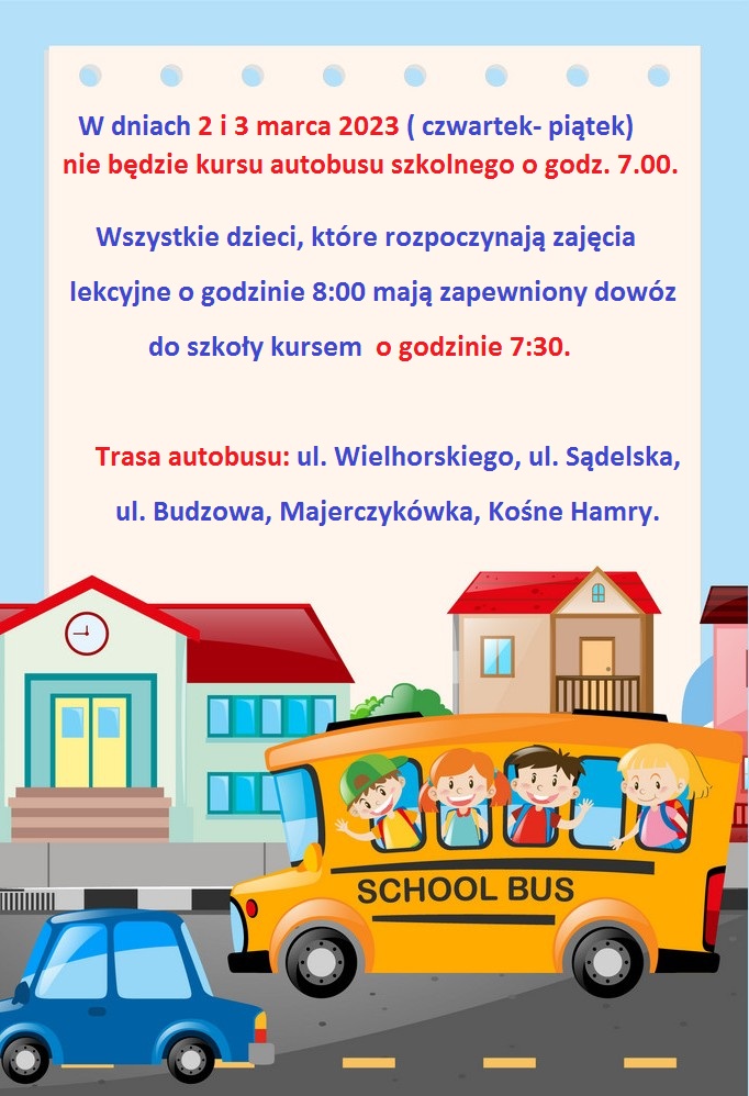 W dniach 2 i 3 marca b. r. (czwartek i piątek) nie będzie pierwszego kursu autobusu szkolnego o 7:00.
