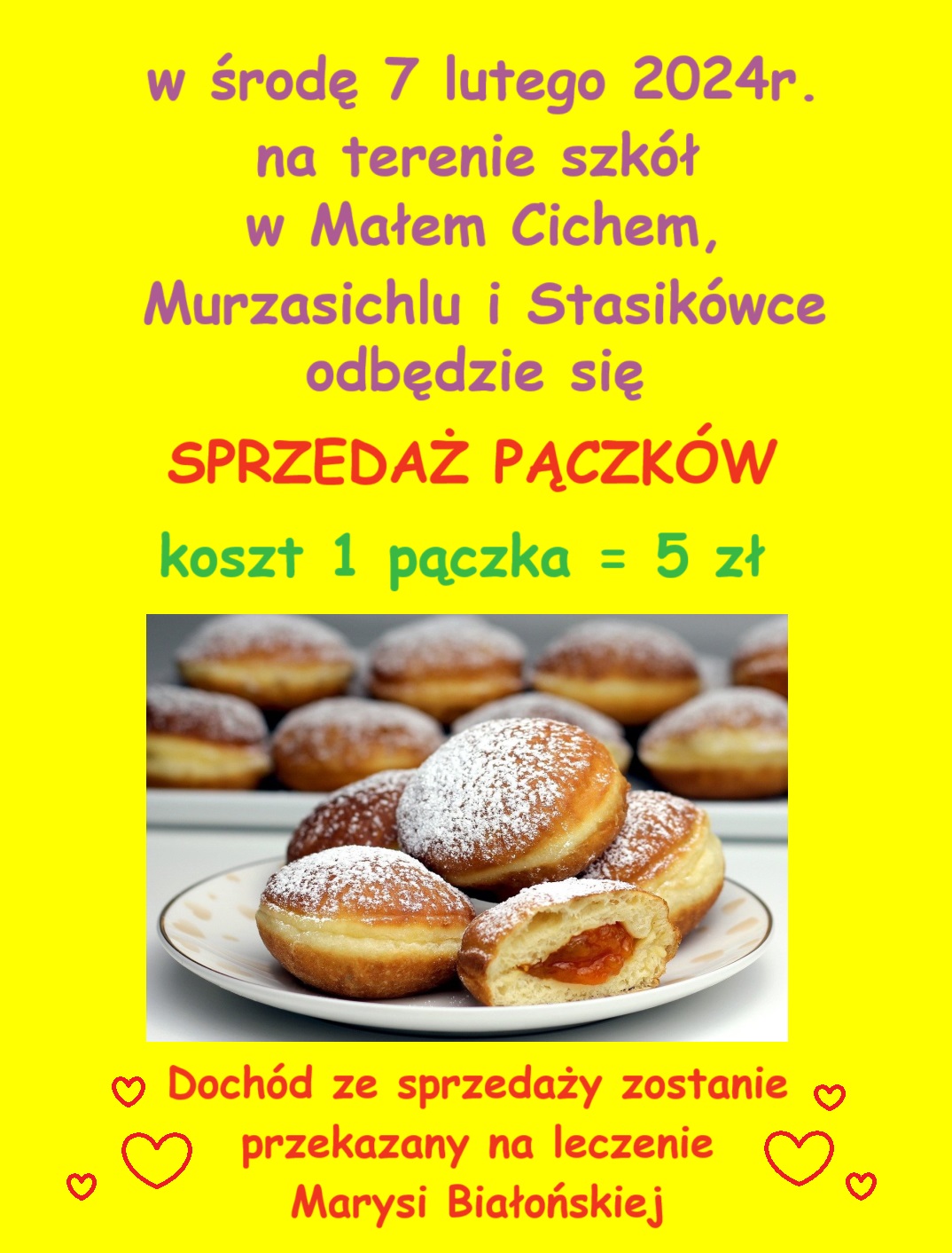 7 lutego w środę uczniowie ze Szkolnego Koła Wolontariatu będą sprzedawać pączki. Sprzedaż odbędzie się na ternie szkół w Murzasichlu, Małem Cichem i Stasikówce. Koszt jednego pączka wynosić będzie 5 zł. Cały dochód ze sprzedaży zostanie przekazany na leczenie Marysi Białońskiej 6-letniej dziewczynki z Bańskiej Niżnej, która traci wzrok i potrzebuje 3 000 000 na jego uratowanie!