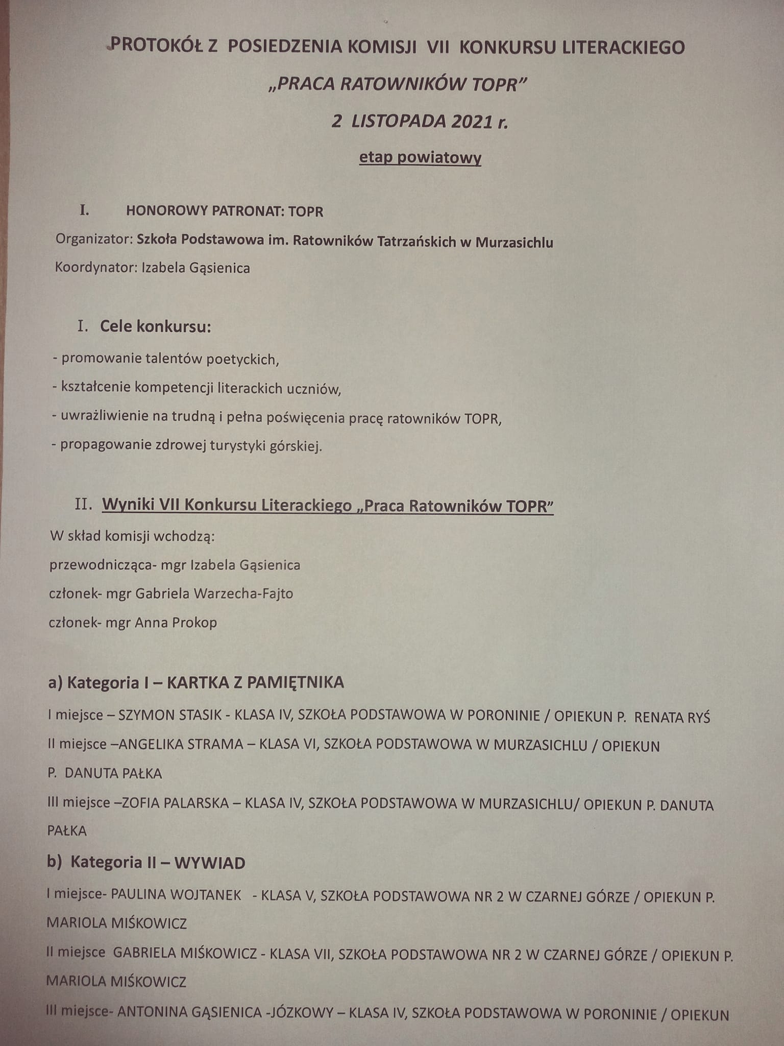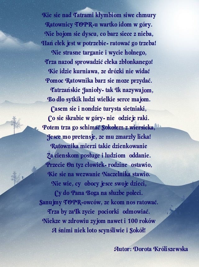 Z okazji 112 ROCZNICY POWSTANIA TATRZAŃSKIEGO OCHOTNICZEGO POGOTOWIA RATUNKOWEGO cała społeczność szkolna życzy WSZYSTKIM RATOWNIKOM TOPR zdrowia, satysfakcji z wykonywanej pracy oraz samych szczęśliwie zakończonych akcji ratunkowych