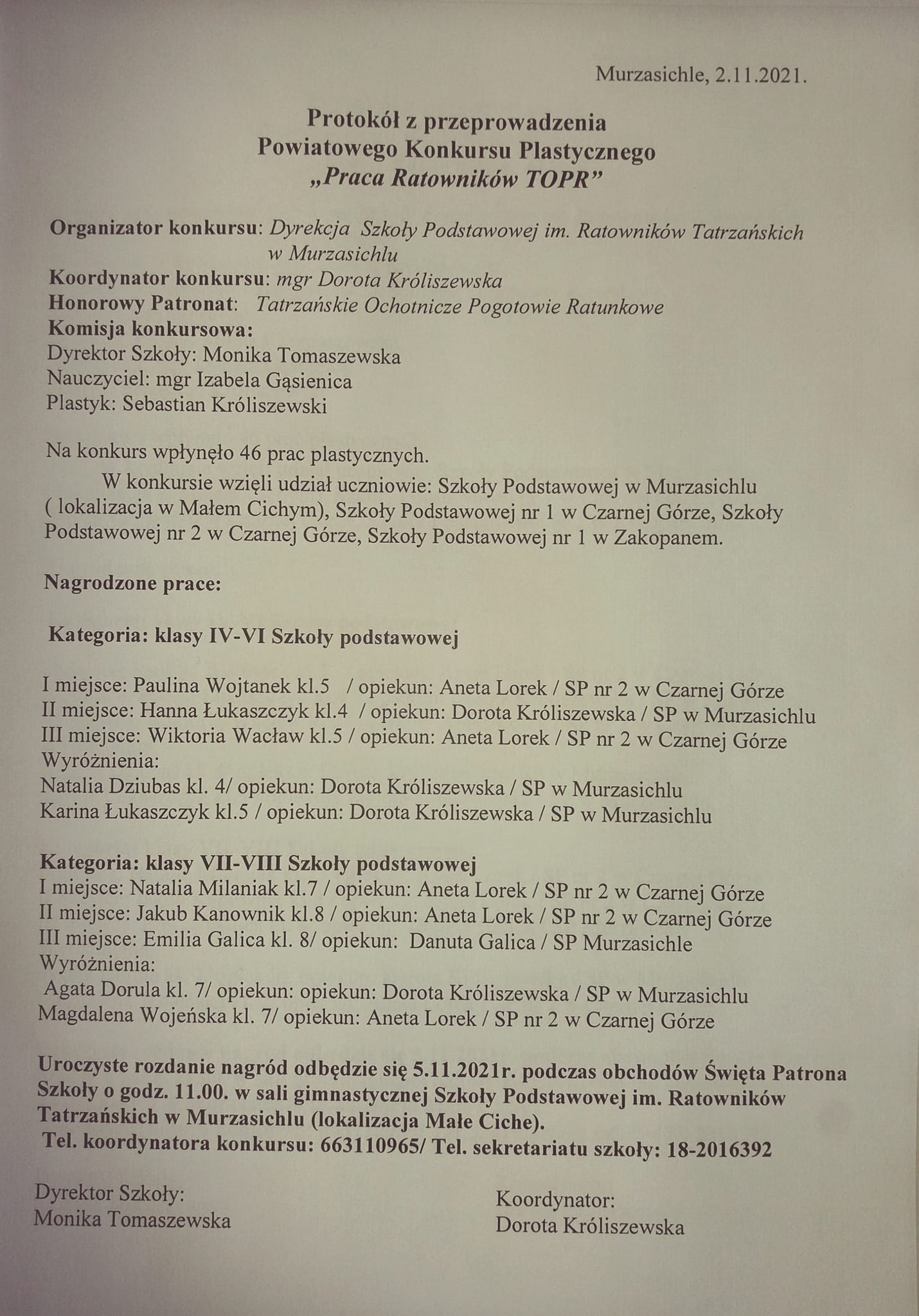 W dniu 27 października 2021 roku w oddziale przedszkolnym w Murzasichlu odbyło się pasowanie na przedszkolaka. Dzieci z grupy Sówki reprezentowały swoje umiejętności wokalne oraz recytatorskie.