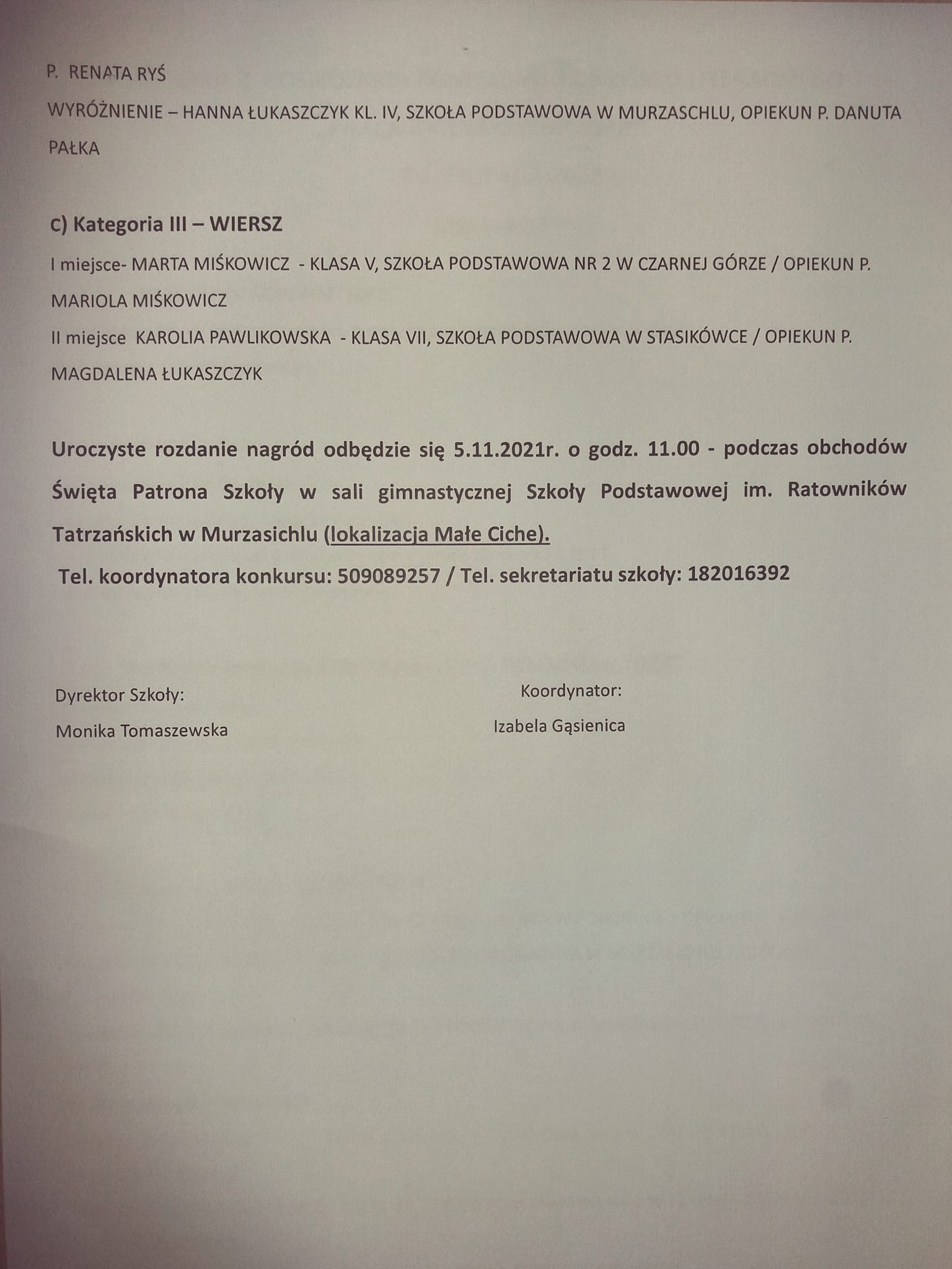 Ogromne gratulacje składamy Pani Dyrektor Monice Tomaszewskiej, Wicedyrektor Beacie Budz i Pani Danucie Pałce, które zostały wyróżnione i nagrodzone przez Wójta Gminy Poronin Panią Anitę Żegleń podczas sesji Rady Gminy Poronin. Pani Wójt podkreśliła ich zaangażowanie w pracy na rzecz połączonych szkół, wkład wysiłku włożonego podczas organizacji zdalnego nauczania oraz reorganizacji placówek. Życzymy Paniom dalszych sukcesów a także powodzenia w życiu prywatnym i zawodowym.