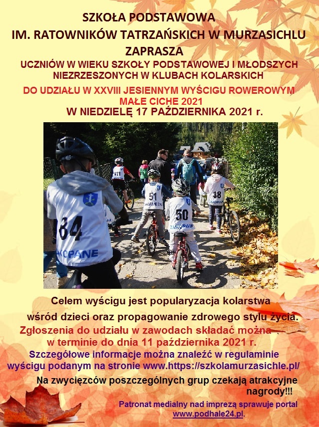Szkoła Podstawowa im. Ratowników Tatrzańskich w Murzasichlu organizuje dnia 17 października 2021 roku XXVIII Jesienny Wyścig Rowerowy.