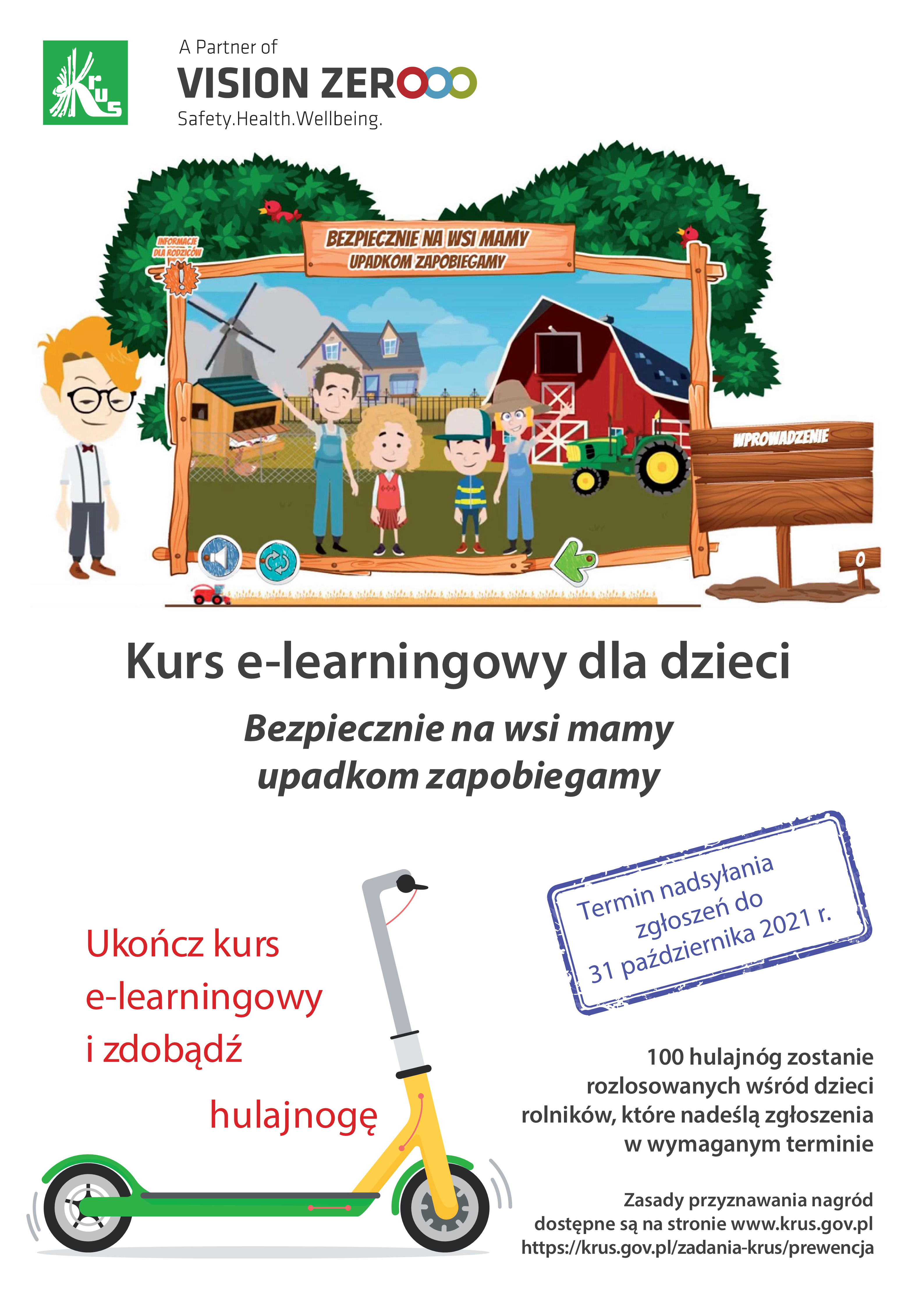 Jeżeli przynajmniej jedno z Państwa jest ubezpieczone w KRUS a Wasze dziecko urodziło się w latach 2007-2015 Kasa Rolniczego Ubezpieczenia Społecznego w Zakopanem zachęca dzieci do wykonania kursu e- learningowego pt. Bezpiecznie na wsi mamy- upadkom zapobiegamy, który dostępny jest pod linkiem: