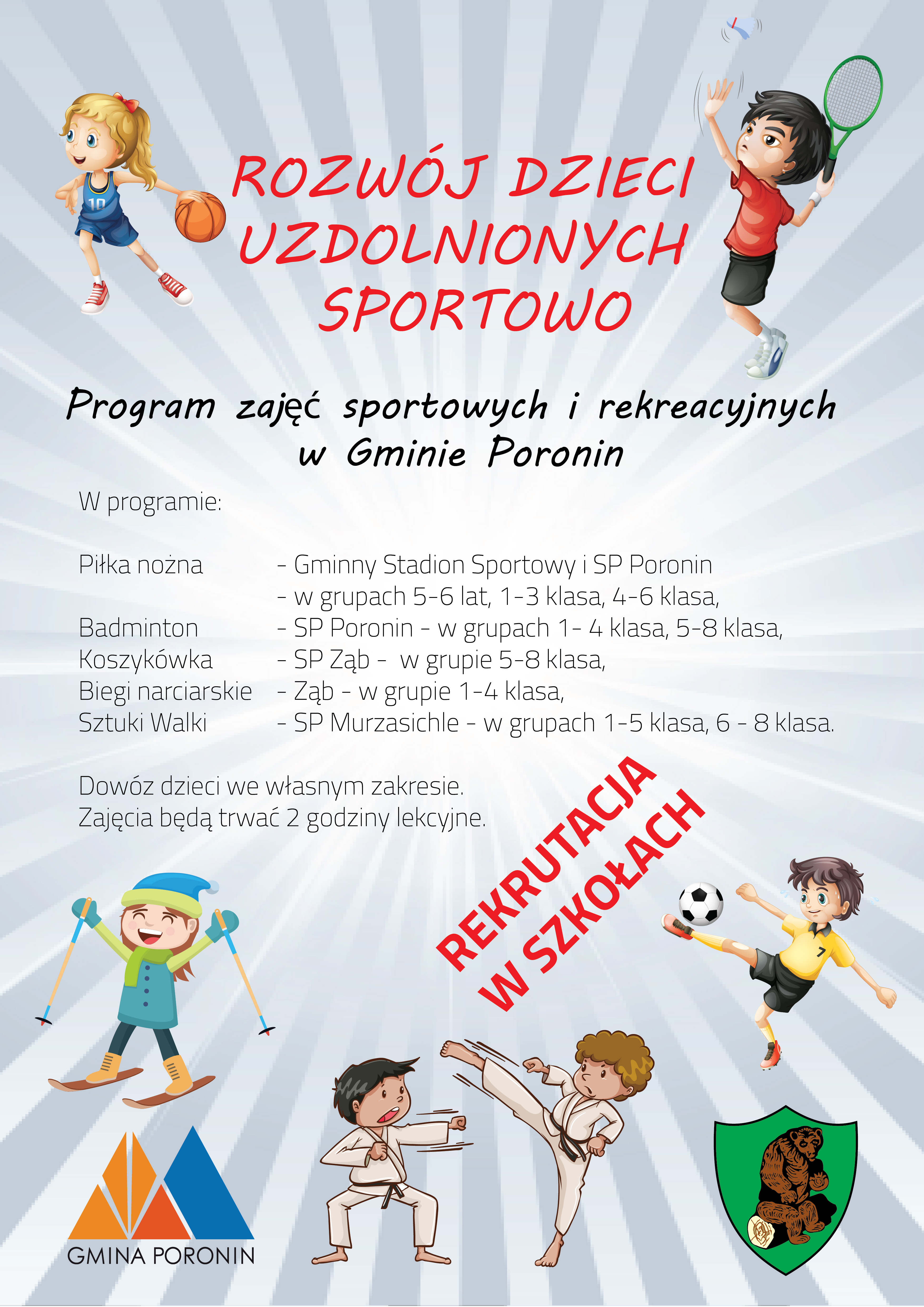 Od 2 września rozpoczynamy rekrutację do mających się odbywać w najbliższych tygodniach zajęć dodatkowych dla dzieci z klas I-VIII Szkół Podstawowych w Gminie Poronin w ramach projektu „Wiem i potrafię” koordynowanego przez Gminę Poronin: