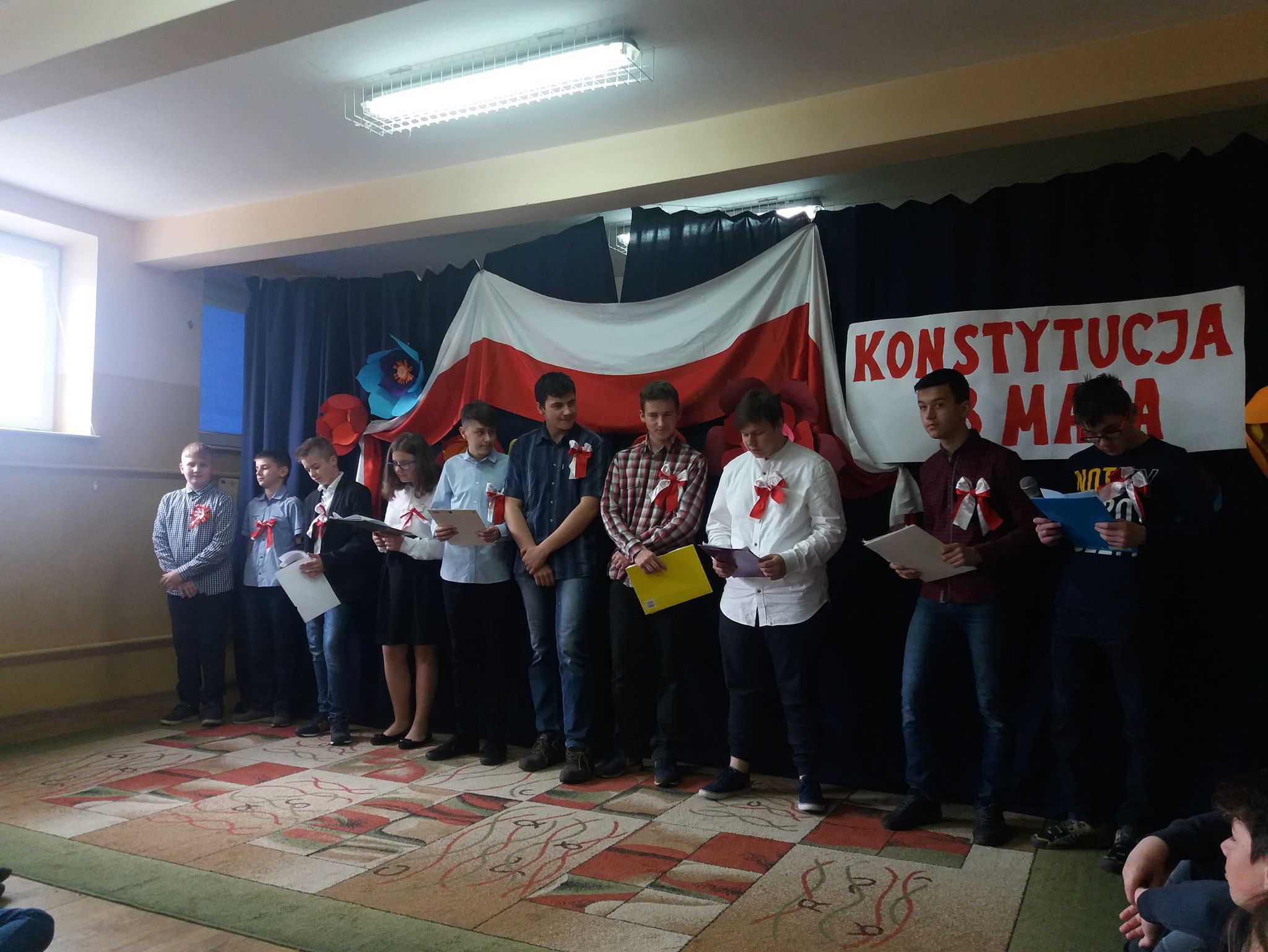 Na świetlicy szkolnej odbył się uroczysty apel, związany z obchodami święta Uchwalenia Konstytucji 3 Maja. Młodzież przypomniała ważne wydarzenia i aktywnych działaczy z roku 1791, którzy mieli wpływ na dalsze losy naszej Ojczyzny. Apel przygotowali uczniowie klasy 3 gimnazjum we współpracy z uczniami klasy 6 szkoły podstawowej. Opiekę nad grupą sprawowała p. Paulina Rymarz.
